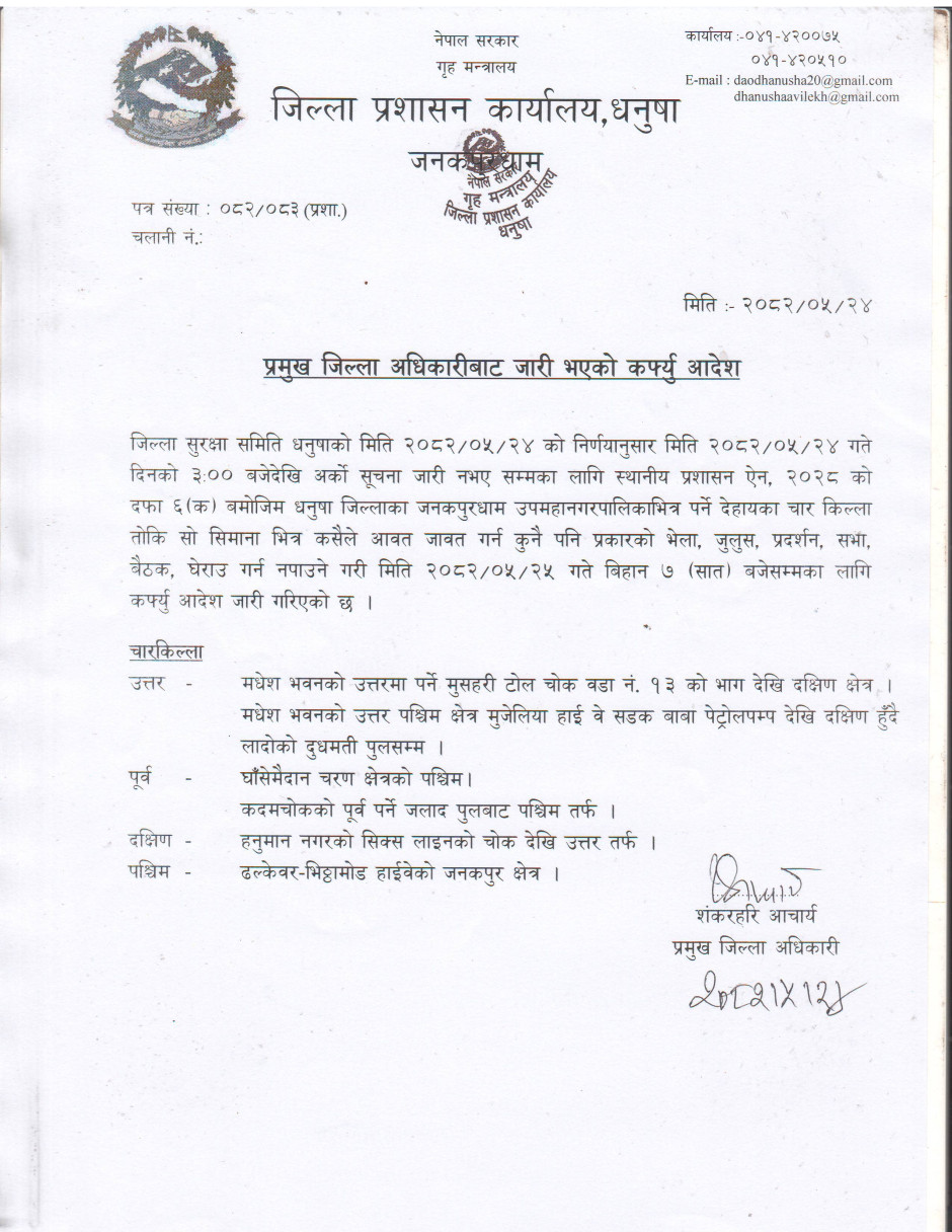 प्रमुख जिल्ला अधिकारीबाट जारी भएको कर्फ्यु आदेश ।
