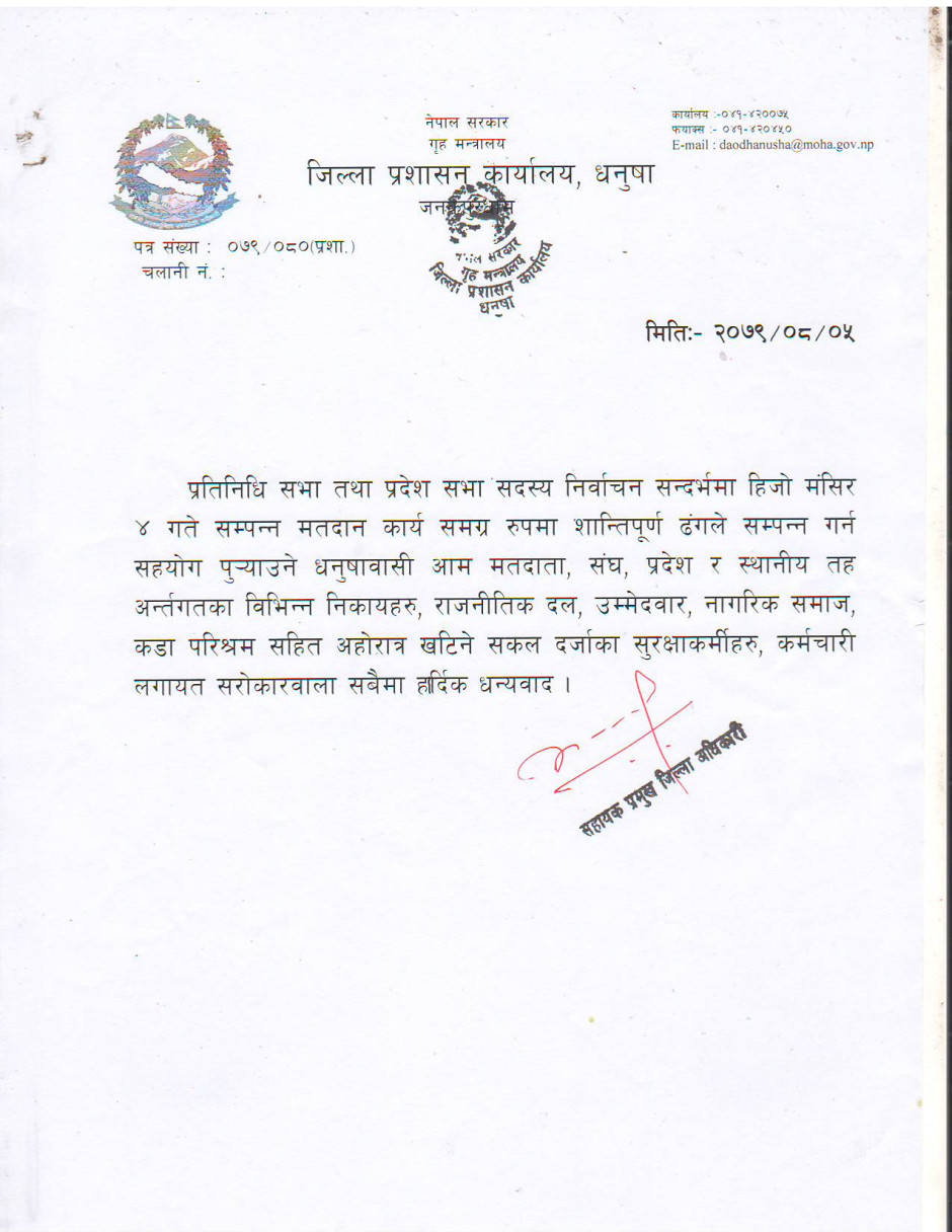 प्रतिनिधि सभा तथा प्रदेश सभा सदस्य निर्वाचन सन्दर्भमा हिजाे मंसिर ४ गते सम्पन्न मतदान कार्य समग्र रुपमा शान्तिपूर्ण ढंगले सम्पन्न गर्न सहयाेग पुर्याने सम्पूर्णमा हार्दिक धन्यवाद ।