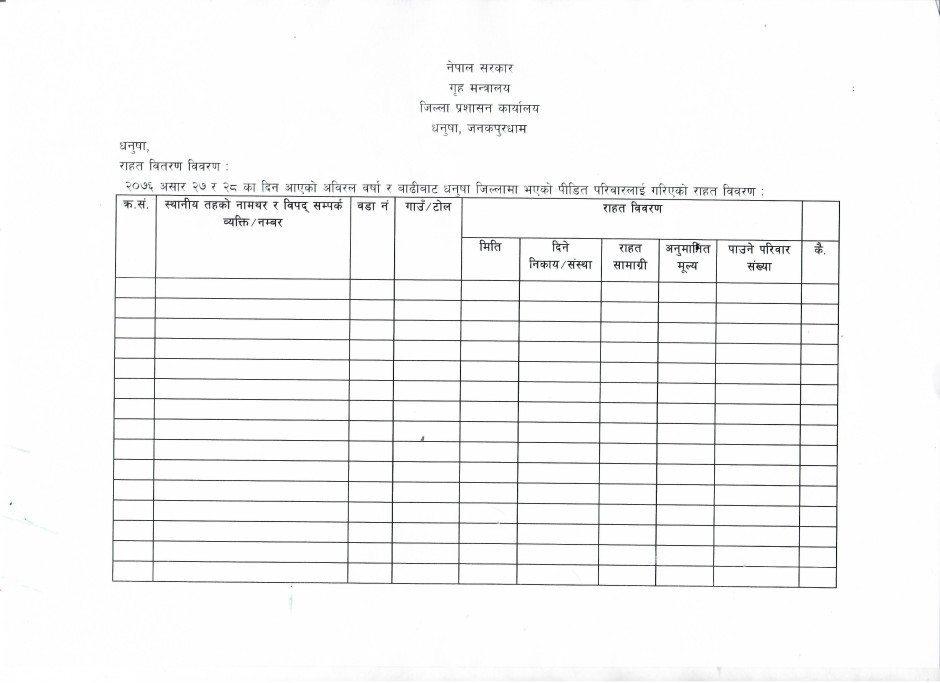 २०७६ असार २७ र २८ का दिन आएको अविरल वर्षा र बाढीबाट धनुषा जिल्लामा भएको पीडित परिवारलाई गरिएको राहत विवरण