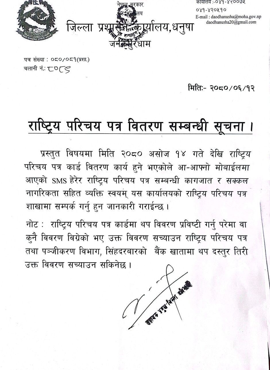 राष्ट्रिय परिचय पत्र कार्ड वितरण सम्बन्धी सूचना