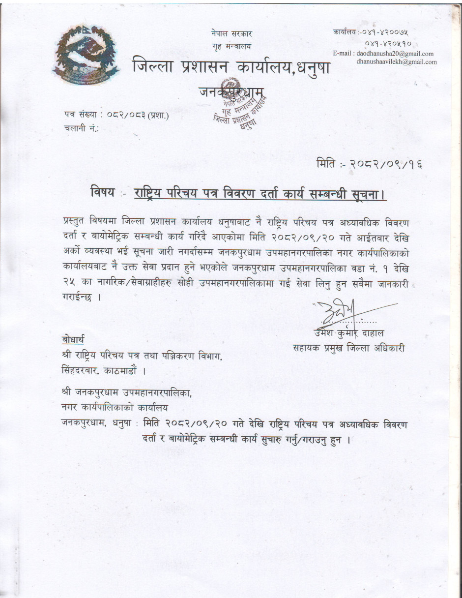 जिल्ला प्रशासन कार्यालय धनुषाबाट जारी गरिएको सूचना ।