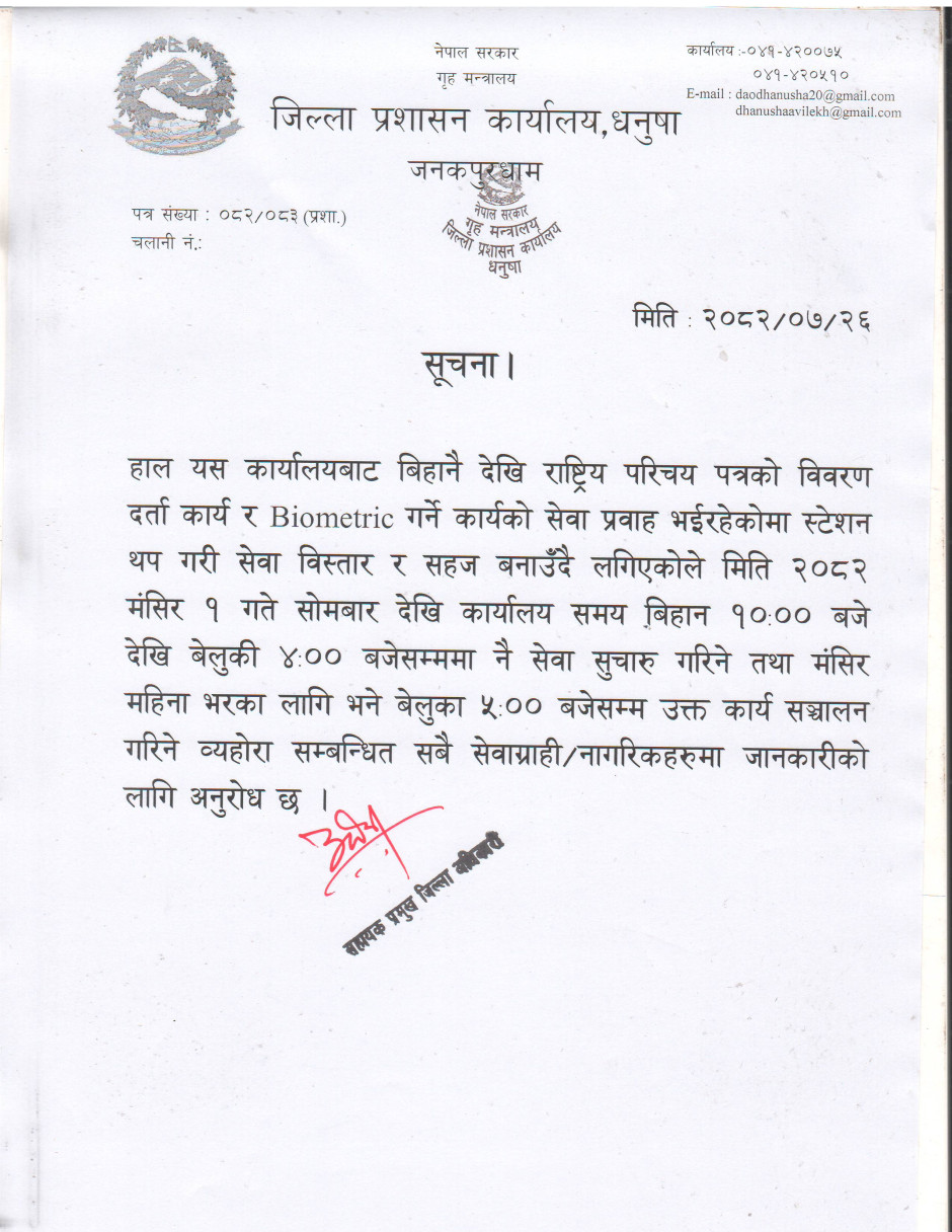 जिल्ला प्रशासन कार्यालय धनुषाबाट जारी गरिएको सूचना ।