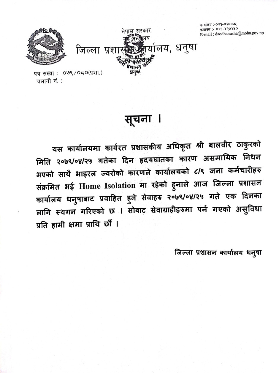 © सर्वाधिकार सुरक्षित जिल्ला प्रशासन कार्यालय, धनुषा