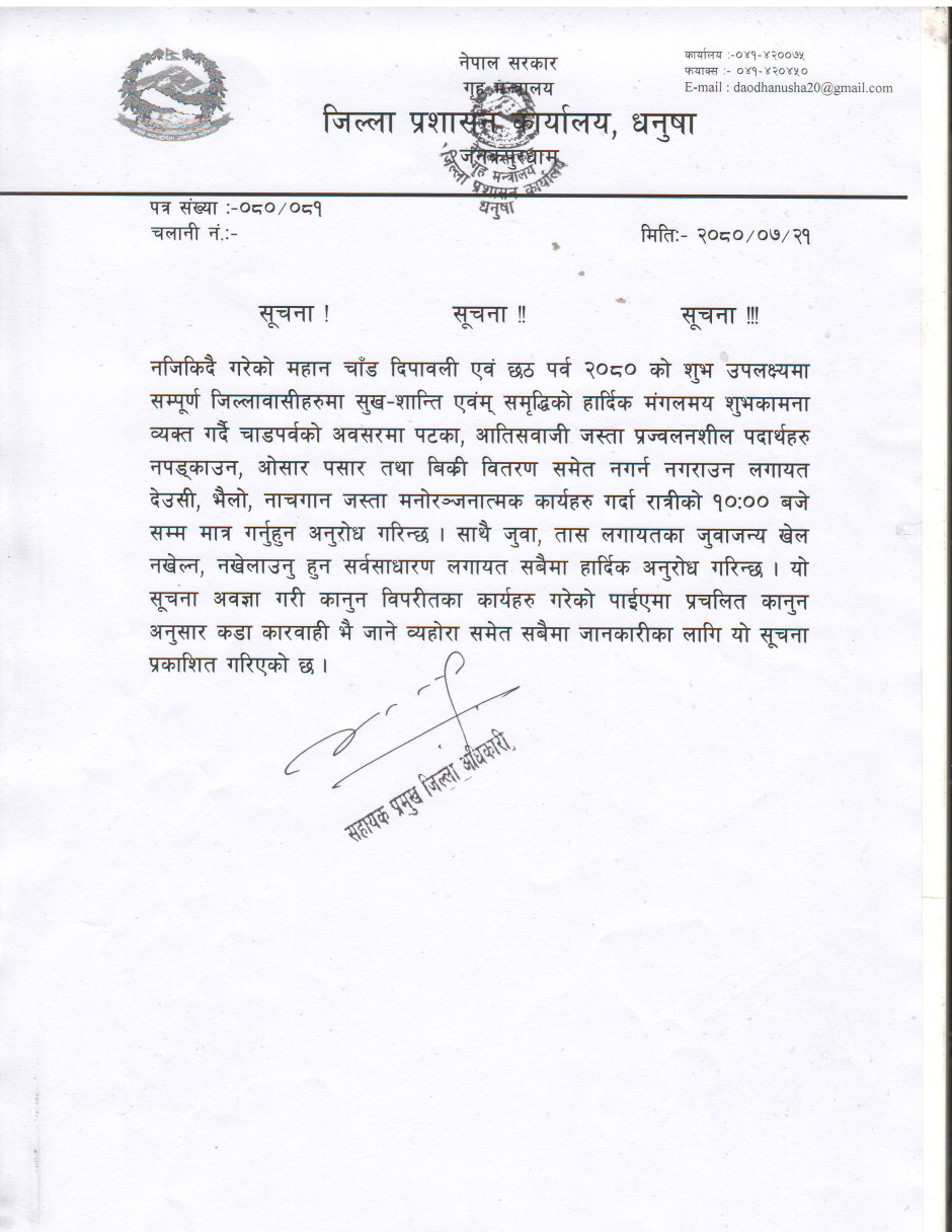 जिल्ला प्रशासन कार्यालय धनुषाबाट जारी गरिएको सूचना ।