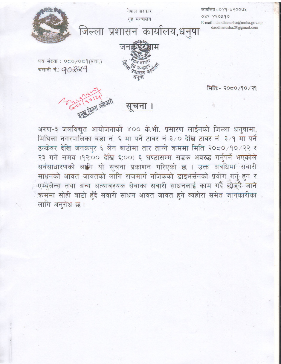जिल्ला प्रशासन कार्यालय धनुषाबाट जारी गरिएको सूचना ।