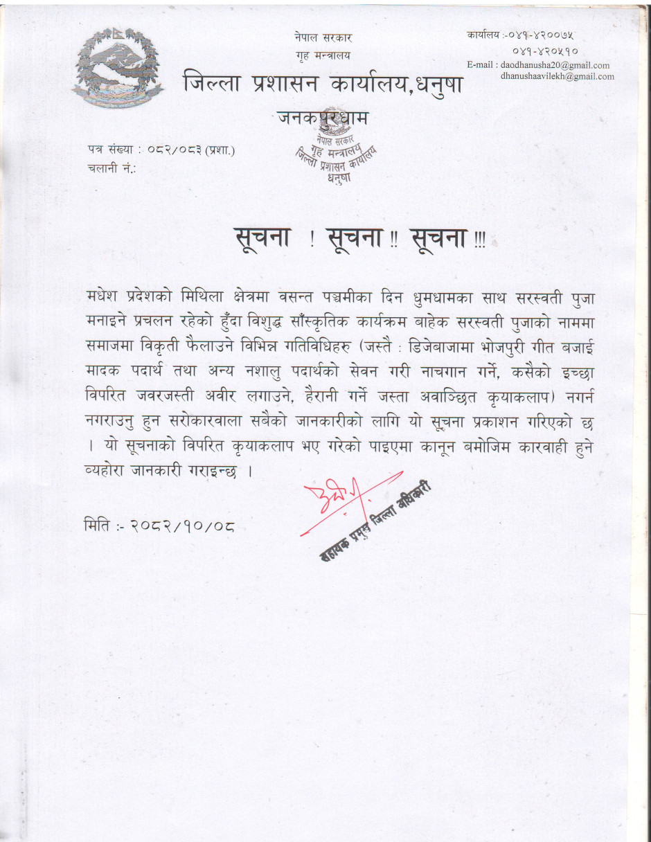 जिल्ला प्रशासन कार्यालय धनुषाबाट जारी गरिएको सूचना ।