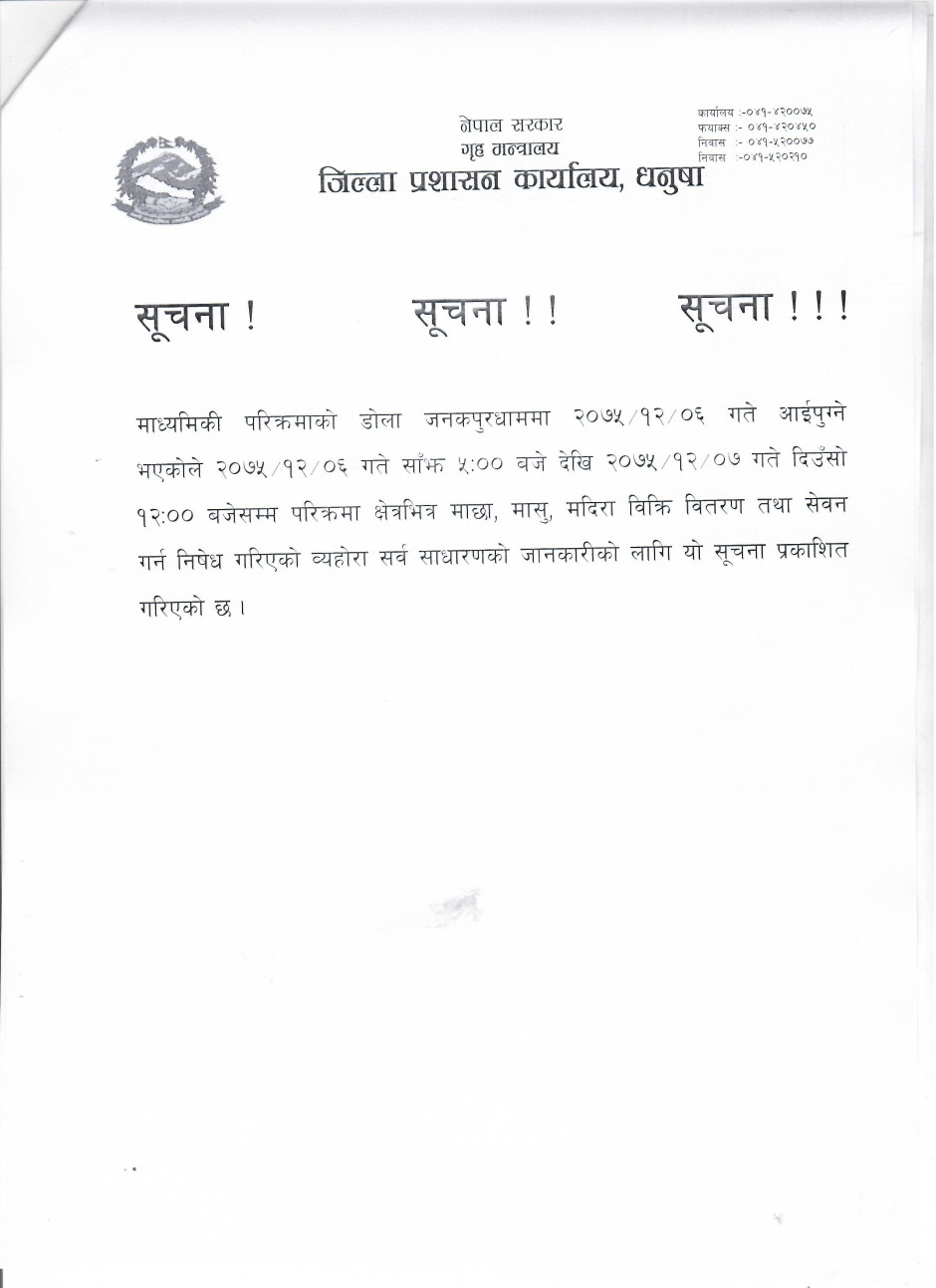 जिल्ला प्रशासन कार्यालय धनुषाबाट जारी गरिएको सूचना ।