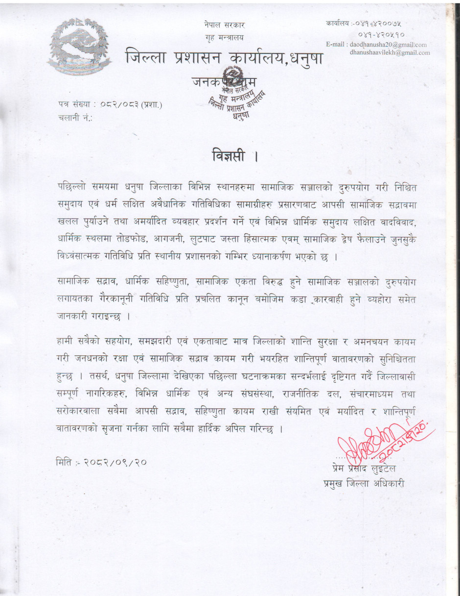 सामाजिक सदभाव कायम गर्न जिल्ला प्रशासन कार्यालय धनुषाबाट गरिएको हार्दिक अपिल ।