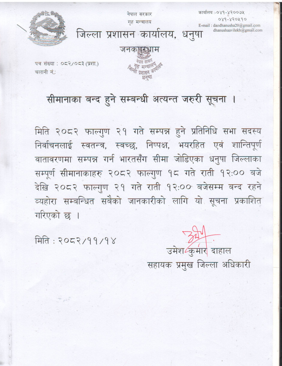 जिल्ला प्रशासन कार्यालय धनुषाबाट जारी गरिएको सूचना ।