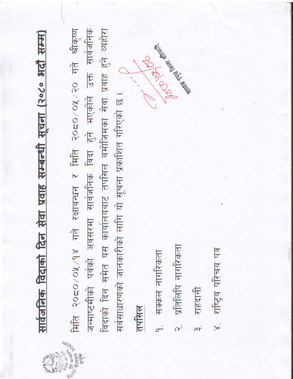 सार्वजनिक विदाको दिन सेवा प्रवाह सम्बन्धी सूचना (२०८० भदौ सम्म)