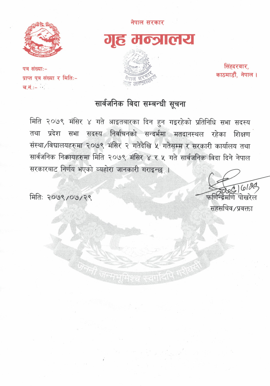 मिति २०८२/१२/२३ गते देखि लागु हुने गरी कार्यालय समय निर्धारण भएको ब्यवस्थाबारे नेपाल राजपत्रमा प्रकाशित सूचना