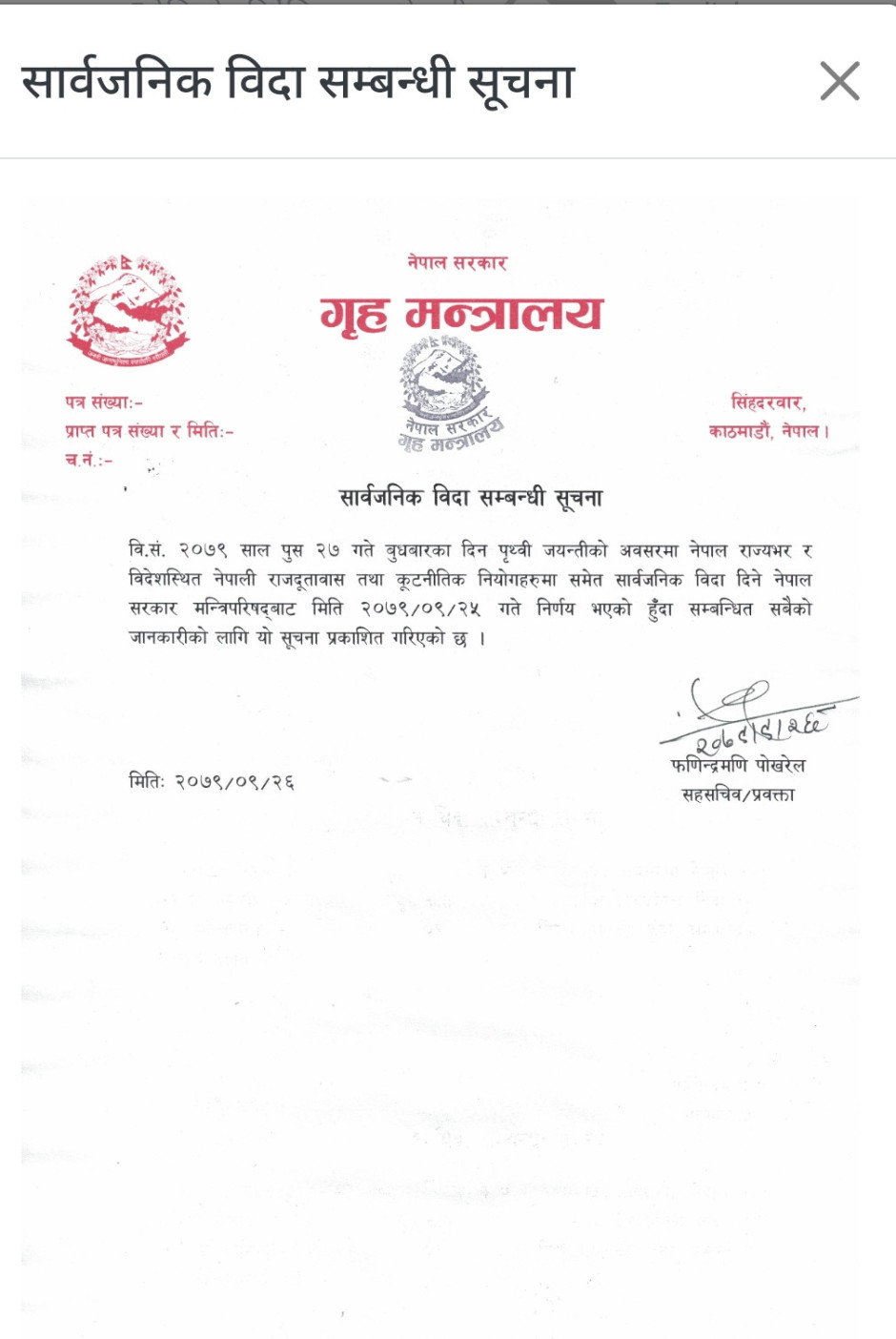 सार्वजनिक विदा सम्बन्धि सूचना