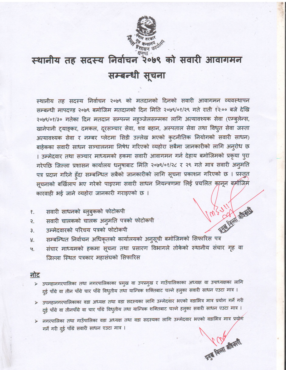 स्थानीय तह सदस्य निर्वाचन २०७९ को सवारी आवागमन सम्बन्धी सूचना