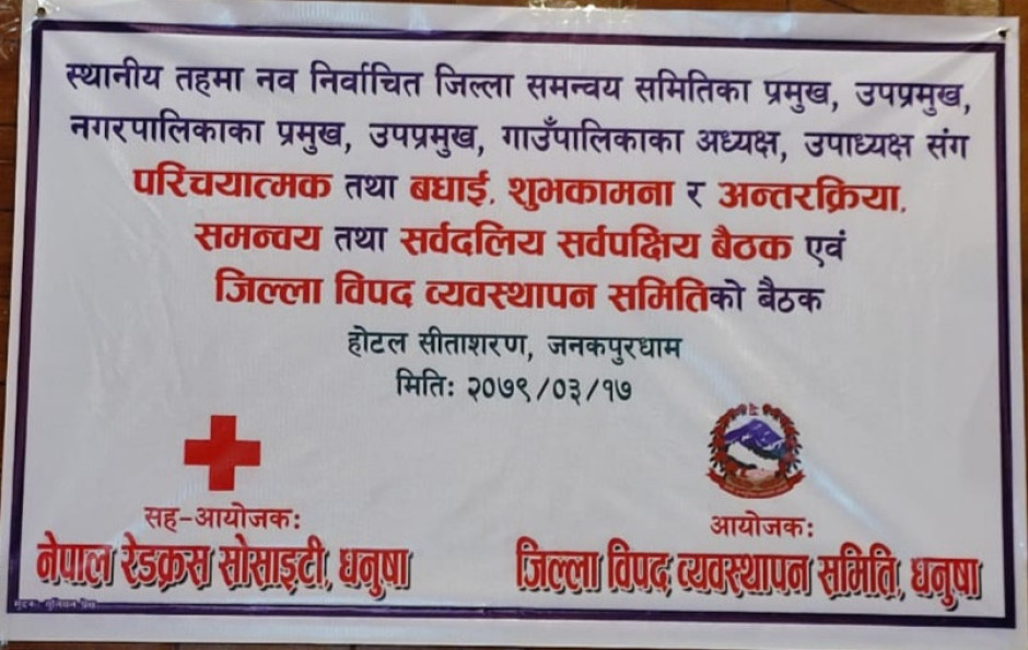 स्थानीय तहमा नव निर्वाचित जिल्ला समन्वय समितिका प्रमुख, उपप्रमुख, नगरपालिकाका प्रमुख, उपप्रमुख, गाउँपालिकाका अध्यक्ष, उपाध्यक्ष सँग परिचयात्मक तथा बधाइ शुभकामना र अन्तरक्रिया कार्यक्रम, समन्वय बैठक, सर्वदलिय सर्वपक्षिय बैठक एवं जिल्ला विपद् व्यवस्थापन समि