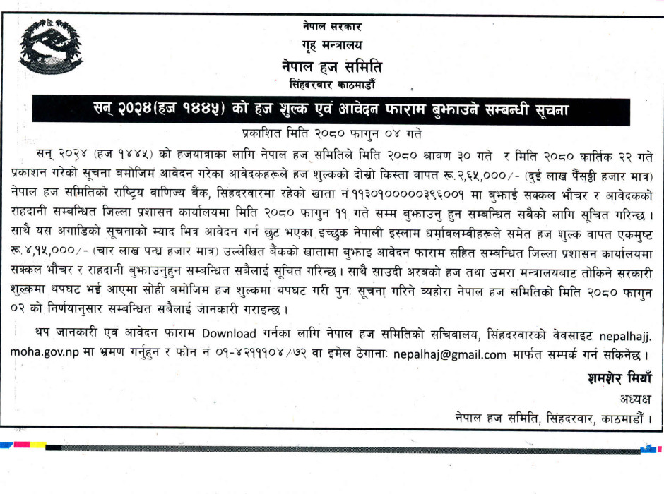 सन् २०२४ (हज १४४५) काे हज शुल्क एवं आवेदन फाराम बुझाउने सम्बन्धी सूचना