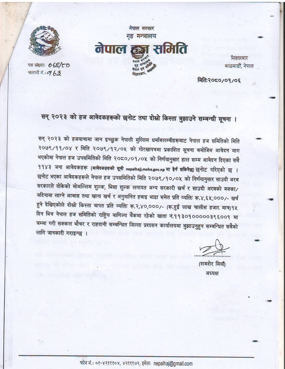 सन् २०२३ काे हज आवेदकहरुकाे छनाेट तथा दाेश्रो किस्ता बुझाउने सम्बन्धी सूचना