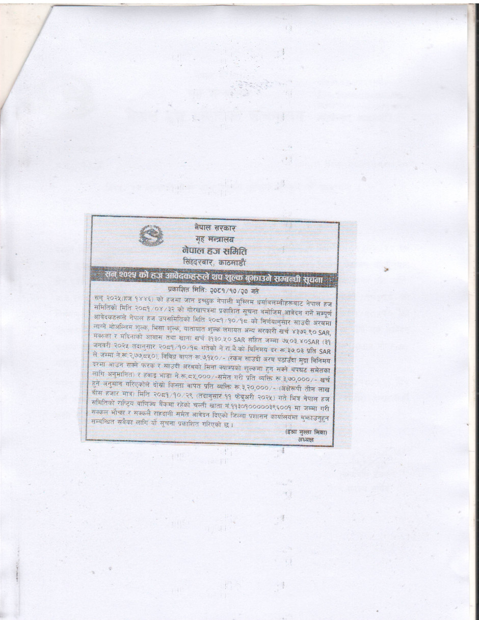 सन् २०२५ को हज आवेदकहरुले थप शुल्क बुझाउने सम्बन्धी सूचना