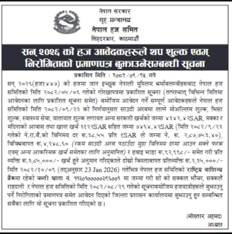 सन् २०२६ काे हज आवेदकहरूले थप शुल्क एवम् निराेगिता प्रमाण पत्र बुझाउने सम्बन्धी सूचना ।