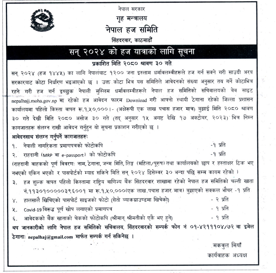 सन् २०२४ काे हज यात्राकाे लागि सूचना