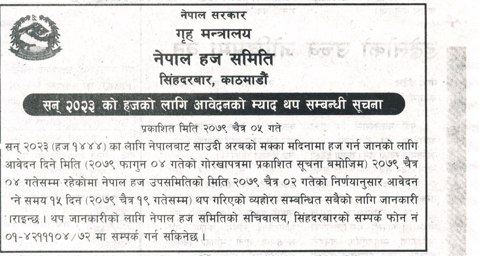 सन् २०२३ को हजको लागि आवेदनको म्याद थप सम्बन्धी सूचना