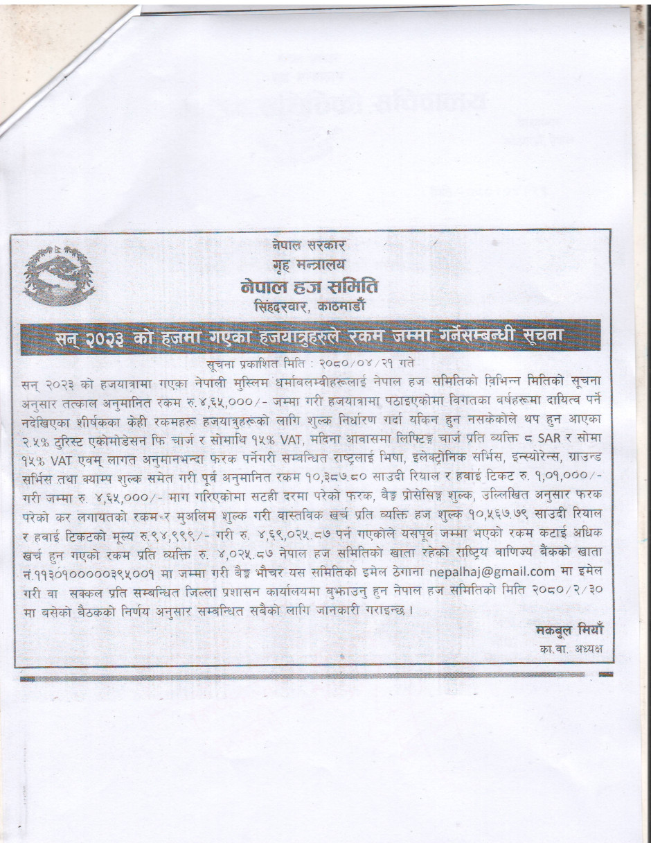 सन् २०२३ काे हजमा गएका हजयात्रुहरुले रकम जम्मा गर्ने सम्बन्धी सूचना