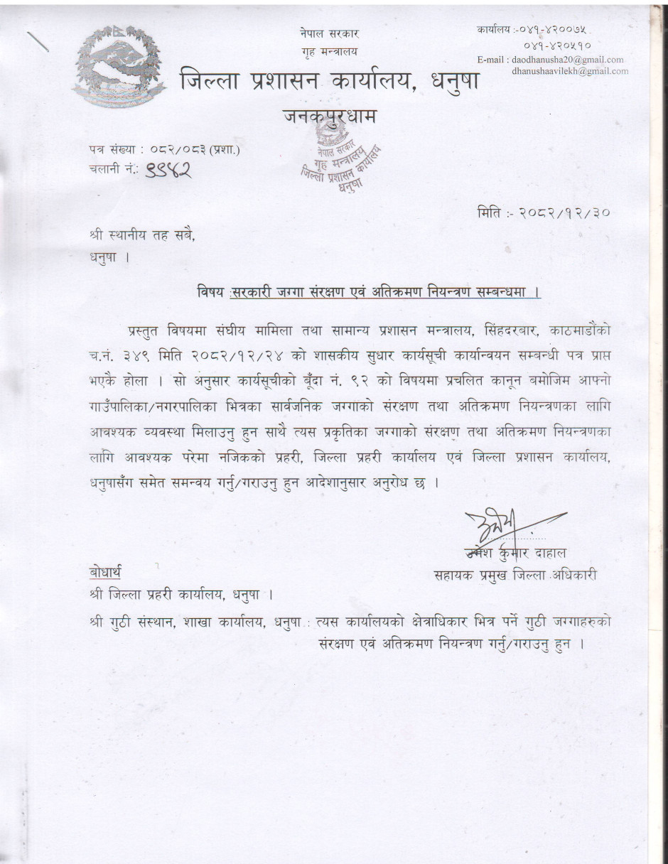 © सर्वाधिकार सुरक्षित जिल्ला प्रशासन कार्यालय, धनुषा