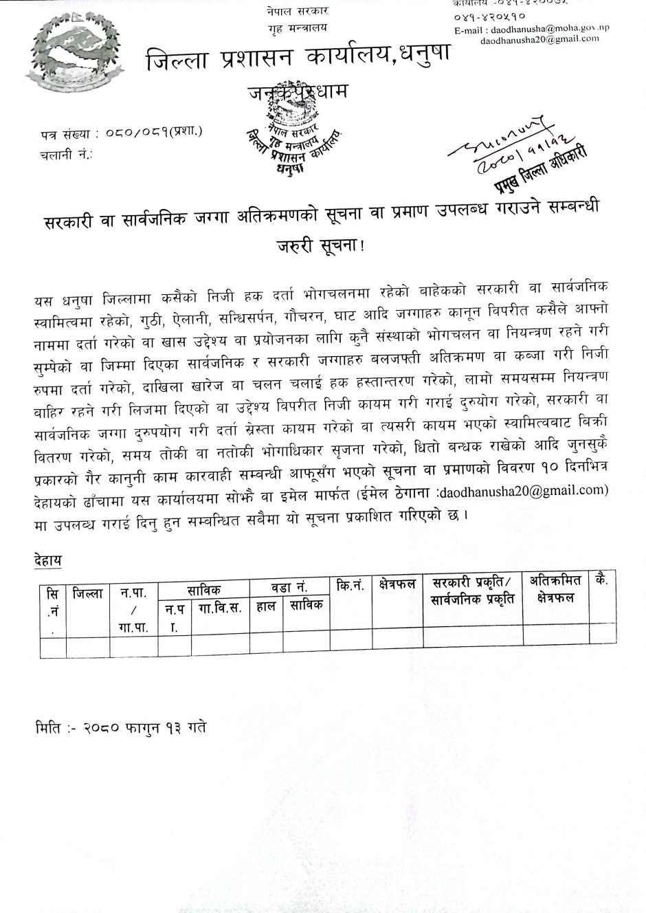 जिल्ला प्रशासन कार्यालय धनुषाबाट जारी गरिएको सूचना ।