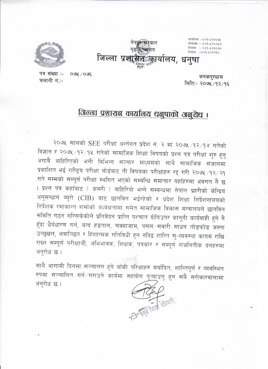 जिल्ला प्रशासन कार्यालय धनुषाको अनुरोध