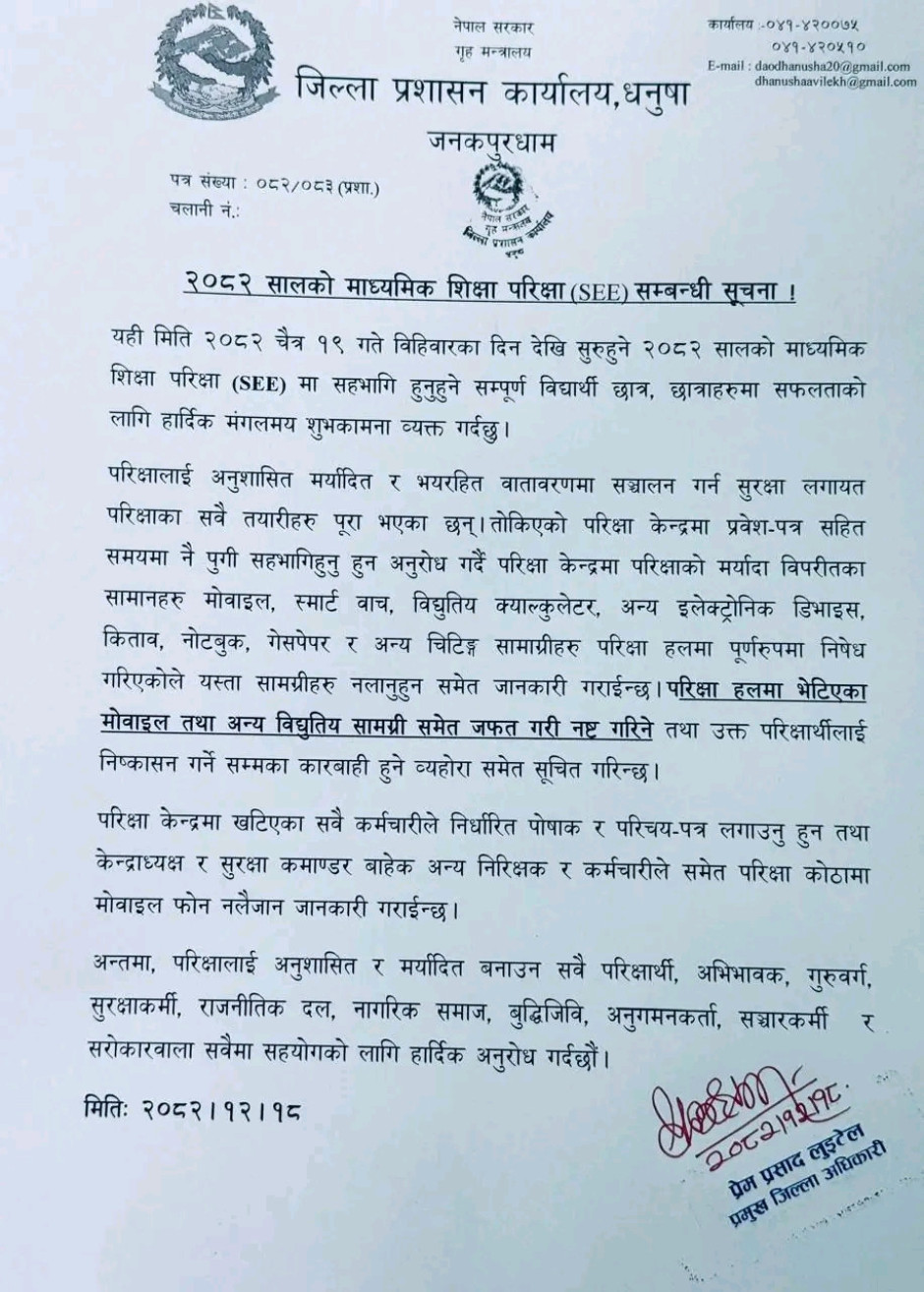 जिल्ला प्रशासन कार्यालय धनुषाबाट जारी गरिएको सूचना ।