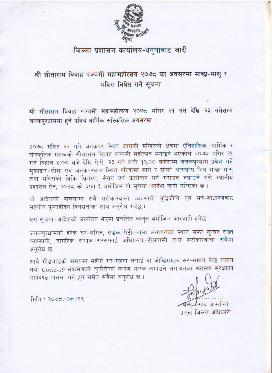 श्री सीताराम विवाह पञ्चमी महामहोत्सव २०७८ का अवसरमा माछा-मासु र मदिरा निषेध गर्ने सूचना
