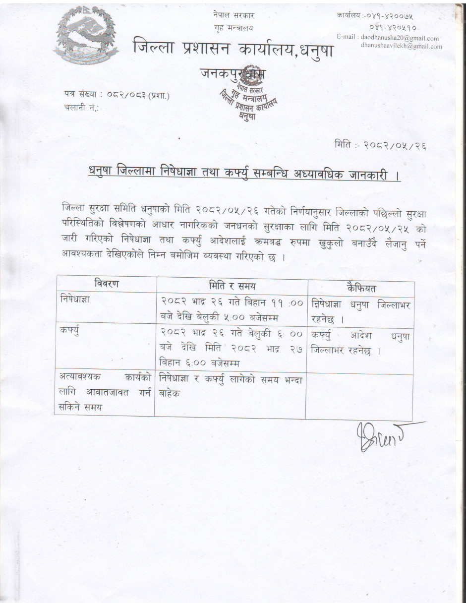 धनुषा जिल्लामा निषेधाज्ञा तथा कर्फ्यु सम्बन्धि अध्यावद्यिक जानकारी ।