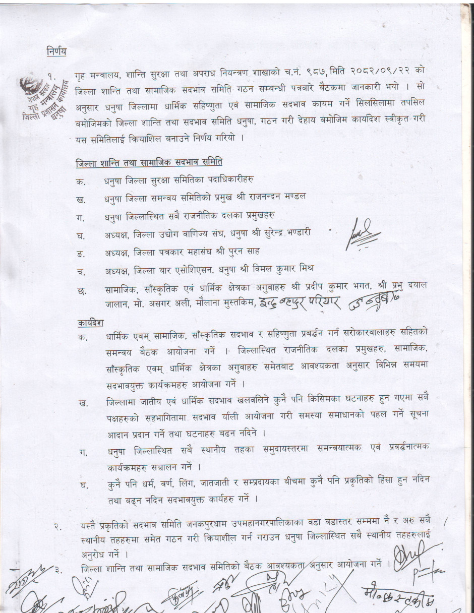 धनुषा जिल्लामा धार्मिक सहिष्णुता एवं सामाजिक सदभाव कायम राख्न जिल्लास्थित सुरक्षा निकायका पदाधिकारीहरु, जिल्लास्थित राजनितीक दल, जनकपुर उद्योग वाणिज्य संघ, जिल्ला पत्रकार महासंघ, सामाजिक साँस्कृतिक एवं धार्मिक क्षेत्रका अगुवाहरु सँग भएको बैठकको निर्णय