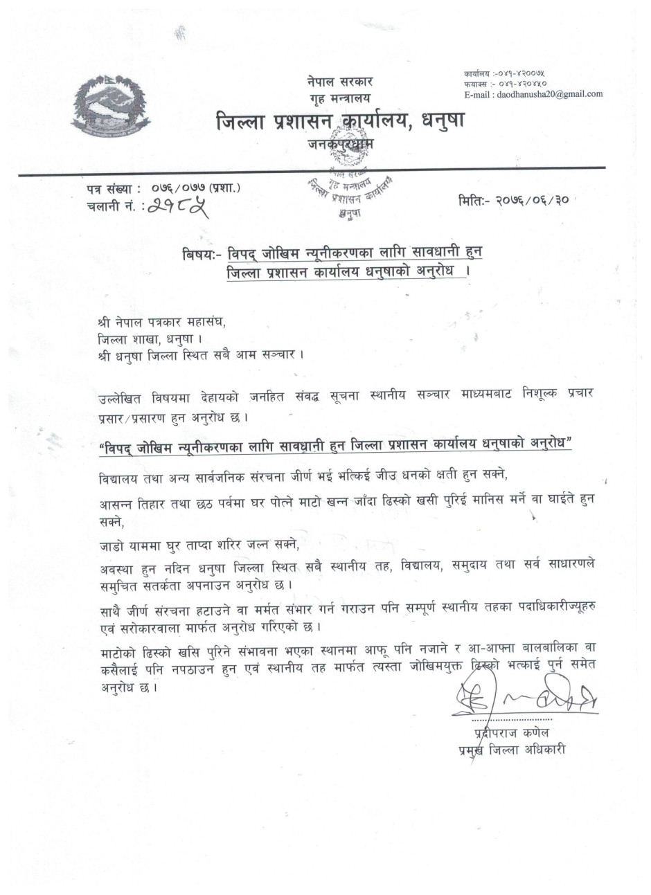 विपद्र जाेखिम न्यूनीकरणका लागि सावधानी हुन जिल्ला प्रशासन कार्यालय धनुषाकाे अनुराेध