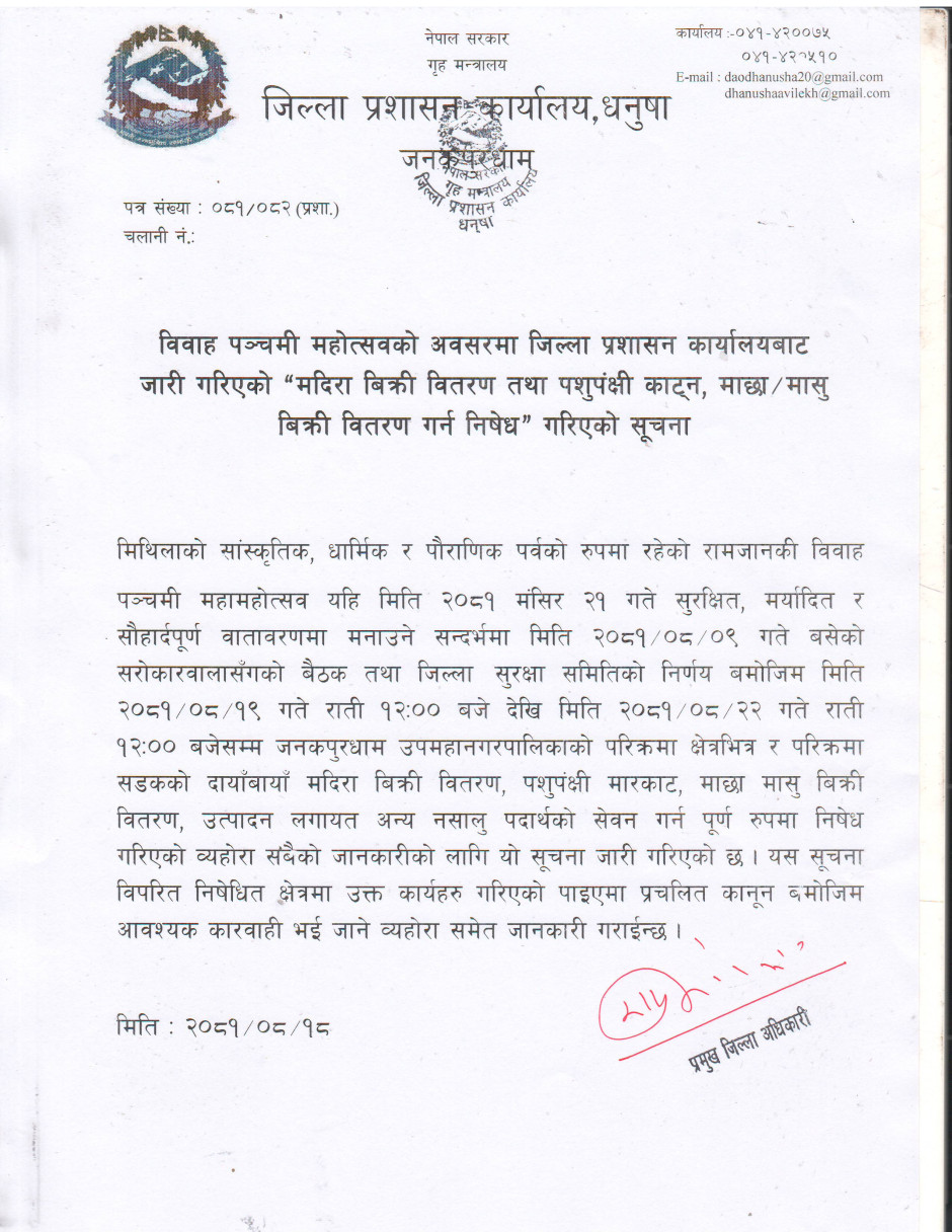 विवाह पञ्चमी महोत्सवको अवसरमा जिल्ला प्रशासन कार्यालयबाट जारी गरिएको ''मदिरा बिक्री वितरण तथा पशुपंक्षी काट्न, माछा /मासु बिक्री वितरण गर्न निषेध'' गरिएको सूचना